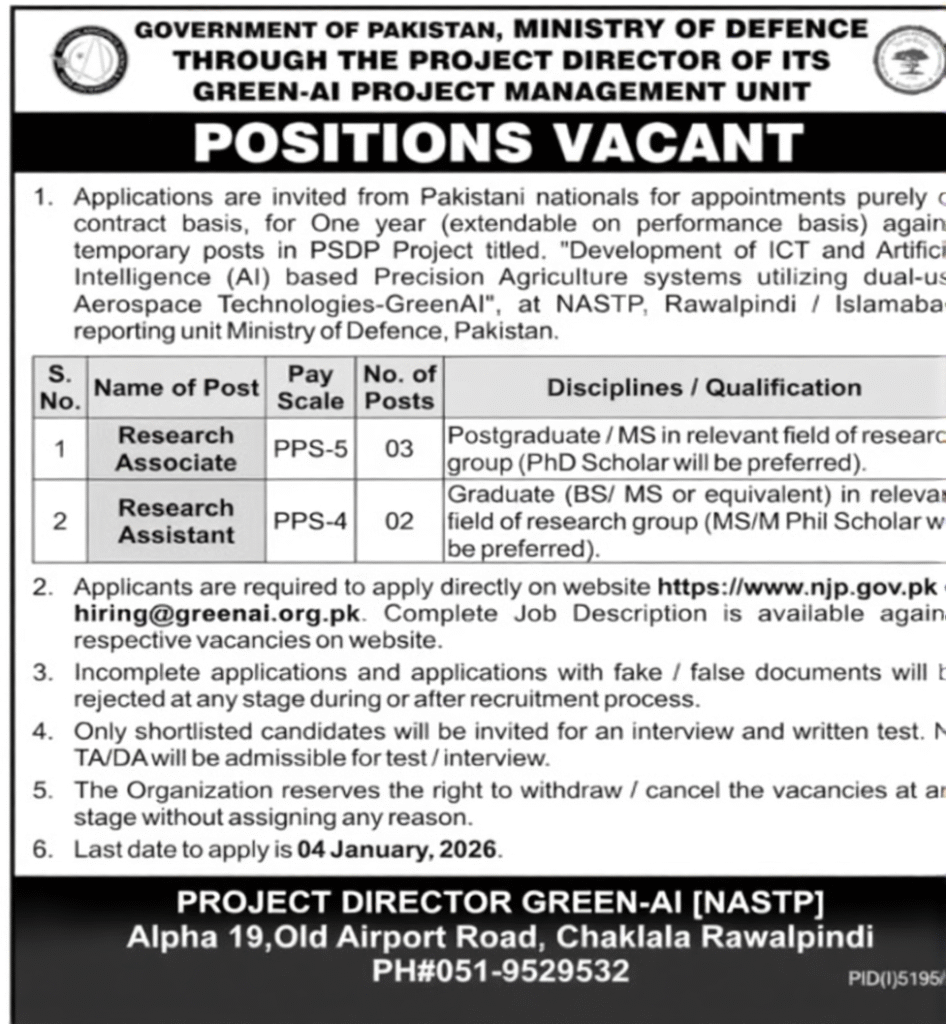 ‎You can see the names of the vacancies available under the PSDF project of the National Aerospace Science and Technology Park (NASTP) below.Research Associate (PPS-5) Research Assistant (PPS-4).Candidates are required to apply for these vacancies. Candidates applying for these vacancies must have strong technical knowledge in the areas of software development, high-performance computing (HPC), networks and cloud computing. It is a must for advancement in this organization. Along with this, research thinking, problem-solving ability and experience working on modern technologies are also very important. This organization prefers individuals who have academic qualifications along with practical experience.The main objective of this project is to introduce smart agriculture solutions by using aerospace technologies in the agricultural sector. These solutions are to monitor crops, increase production, and help in better use of resources and reduce environmental impact. With the help of artificial intelligence and ICT, data-based decisions will be made, which will form the basis of modern agriculture.