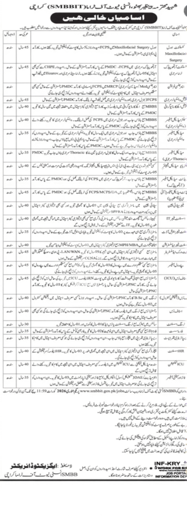 SMBB is currently inviting applications from candidates for various Medical, Nursing, Engineering, IT, Administrative and Support Staff vacancies. This is a great opportunity for those candidates who want to build a stable and prestigious career within the government sector in Karachi. The institution gives top priority to professionalism and good patient care.