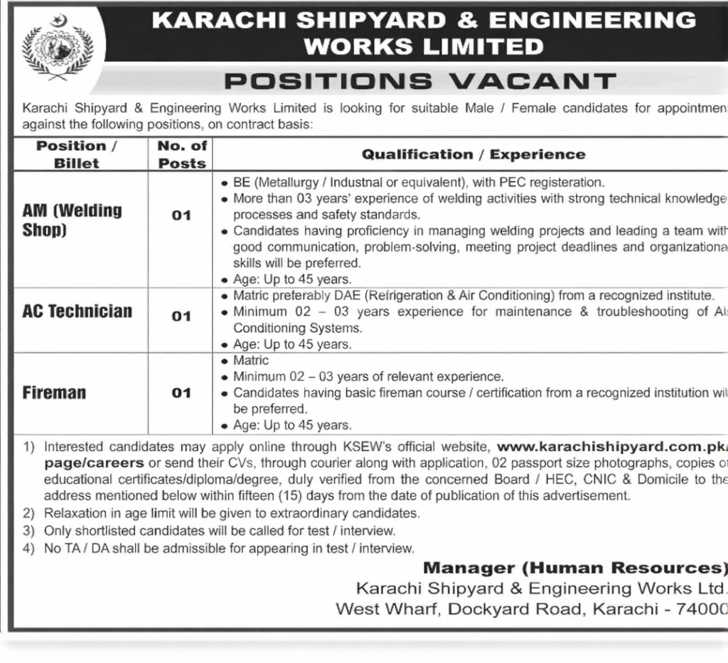 According to the current advertisement for the vacancies announced by Karachi Shipyard, candidates who are educated, skilled, hardworking and disciplined should apply for these vacancies and create a successful future.Names of Karachi Shipyard and Engineering Works jobs that are vacant.AM (Welding Shop) AC Technician Fireman).These are the best vacancies for those living in Karachi and these vacancies have been issued keeping in mind the needs of the organization.One of the major reasons for Karachi Shipyard jobs is that they offer attractive salaries and additional benefits and the selected candidates are given a good salary package as per the market. In addition, medical facilities and other government benefits are also provided. That is why people wait for these jobs.