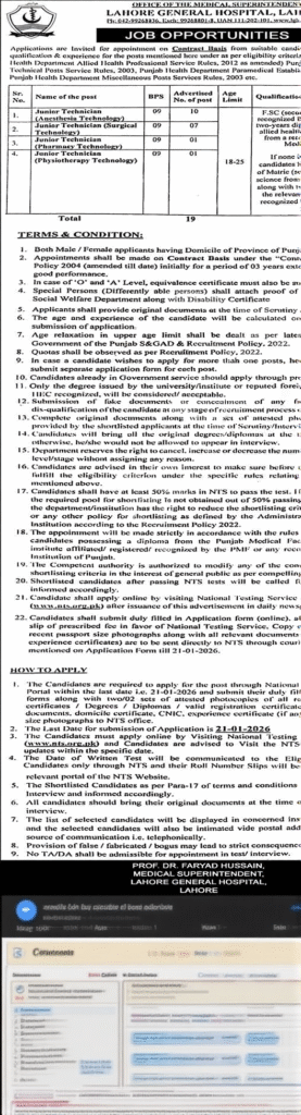 ‎‎The vacancies mentioned by Lahore General Hospital include vacancies related to various technical fields. The persons appointed to these vacant posts will have to take care of the patients and handle the daily routine of the hospital. (Junior Technician Anesthesia Technology, Junior Technician Surgical Technology, Junior Technician Pharmacy Technology and Junior Technician Physiotherapy Technology  are government vacancies of this institution). These vacancies are beneficial for those who have a passion for working in the practical field and want to take advantage of their expertise in the medical field. These posts will be filled as per the recruitment policy of the Government of Punjab.The purpose of this recruitment is to recruit candidates for these posts on merit, therefore, aspiring candidates must check their education, qualifications, experience, etc. before applying. Working in this excellent hospital not only provides candidates with a means of professional development but also provides them with an opportunity to serve the public.