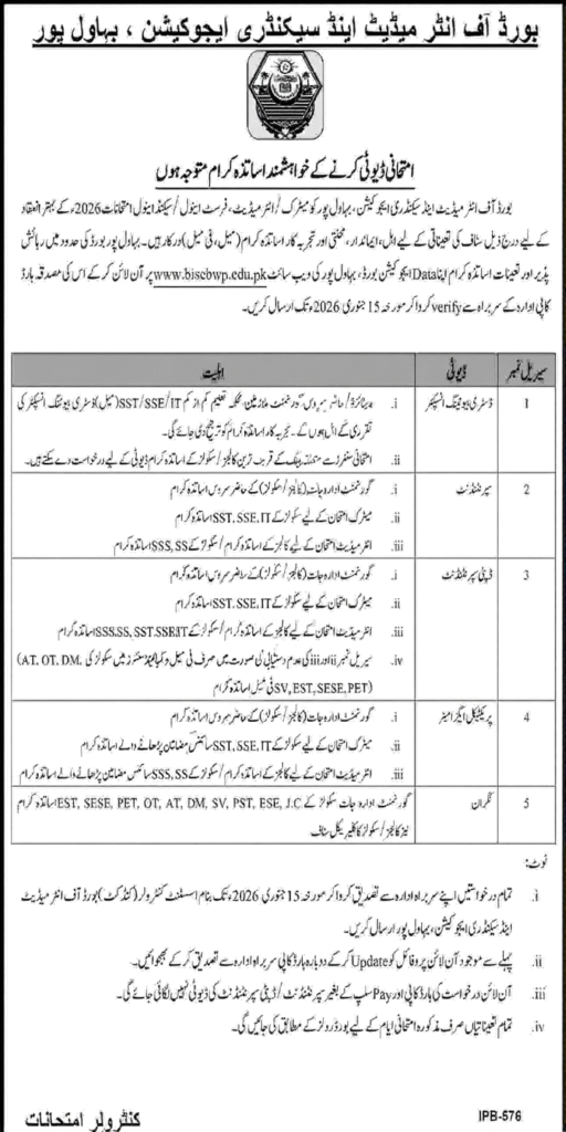 Today, the New Board of Intermediate and Secondary Education Bahawalpur 2026 jobs have been announced for the people of Punjab. Candidates will be recruited temporarily for these posts. These job opportunities have been offered for conducting the annual examinations of Matriculation and Intermediate. Candidates who want to apply for these jobs can visit the official website of the board and download the application form for these jobs at www.bisebwp.edu.pk.BISE Bahawalpur is one of the renowned educational boards of Punjab. It is an excellent institution. This institution conducts examinations of millions of students every year in a transparent and organized manner. To improve the examination system, this board needs experienced, educated, responsible and good staff. That is why the recruitment of these posts has been released.This institution is affiliated to a government educational institution. If you also want to get experience in examination duty, then BISE Bahawalpur jobs are a great opportunity for you. All candidates can apply for these jobs and benefit from these jobs and play their role in improving the education system.