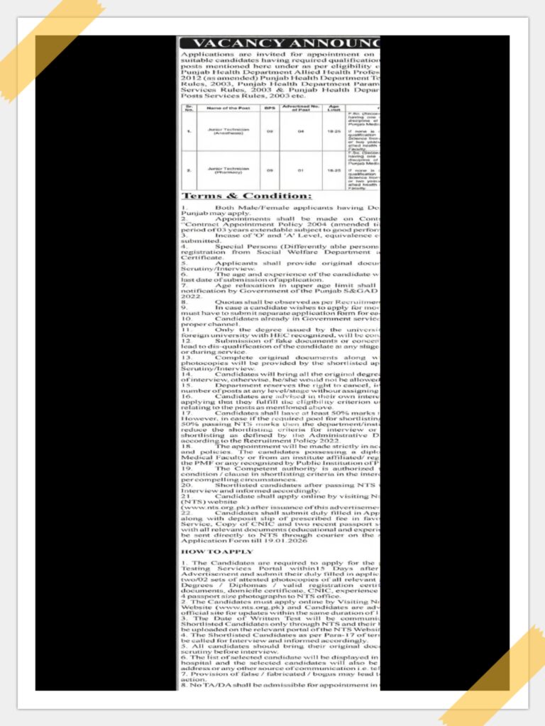 Education: Candidates who wish to apply for these posts must have a recognized diploma in the relevant field and the educational qualification must be F.Sc. (Pre-Medical).