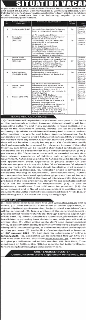 C&W Department Khyber Pakhtunkhwa has released jobs for 2026. This department has announced the latest various government vacancies. These job opportunities are best for those who want to make a secure and respectable career in this government sector. If we talk about this institution, then this department is one of the important government institutions of Khyber Pakhtunkhwa. This institution is responsible for the construction and maintenance of roads, bridges and other infrastructure.Applications are being invited from candidates for these government jobs through etea.