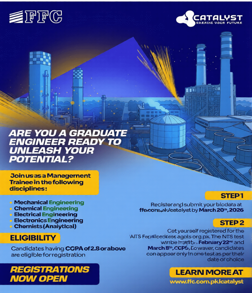 Today, Fauji Fertilizer Company has announced the 2026 jobs. This organization is considered one of the leading industrial organizations in Pakistan. This company has been playing an important role in strengthening the Pakistani economy and agricultural sector for a long time. This organization is paying special attention to modern technology, professional environment and human resource development, which is why this organization gives a large number of graduates the opportunity to become a part of this organization every year. Fauji Fertilizer Company Management Trainee Jobs are a great opportunity for graduates who want to start their life with a reputable and stable organization. This fauji fertilizer company is inviting applications from candidates for various management trainee positions, including major subjects in engineering and chemistry.