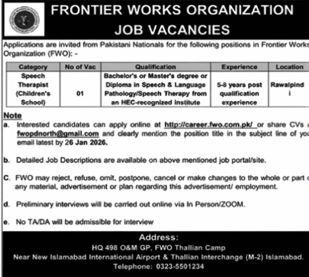 • Candidates applying for Frontier Works Organization jobs should have a Masters/Bachelor’s degree in Speech and Language Pathology/Speech Therapy from an HEC recognized institute or a diploma is required for these posts.