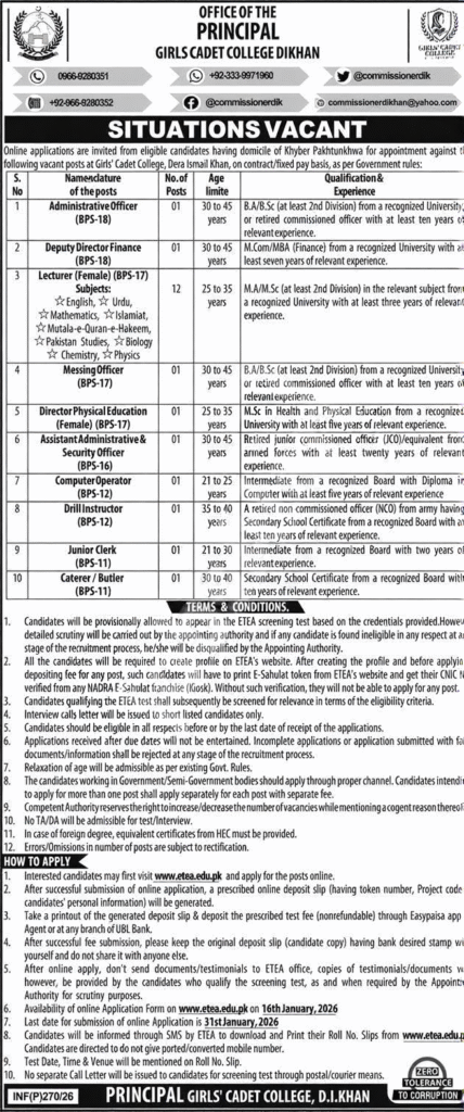 How to apply for Girls Cadet College DI Khan 2026 jobs