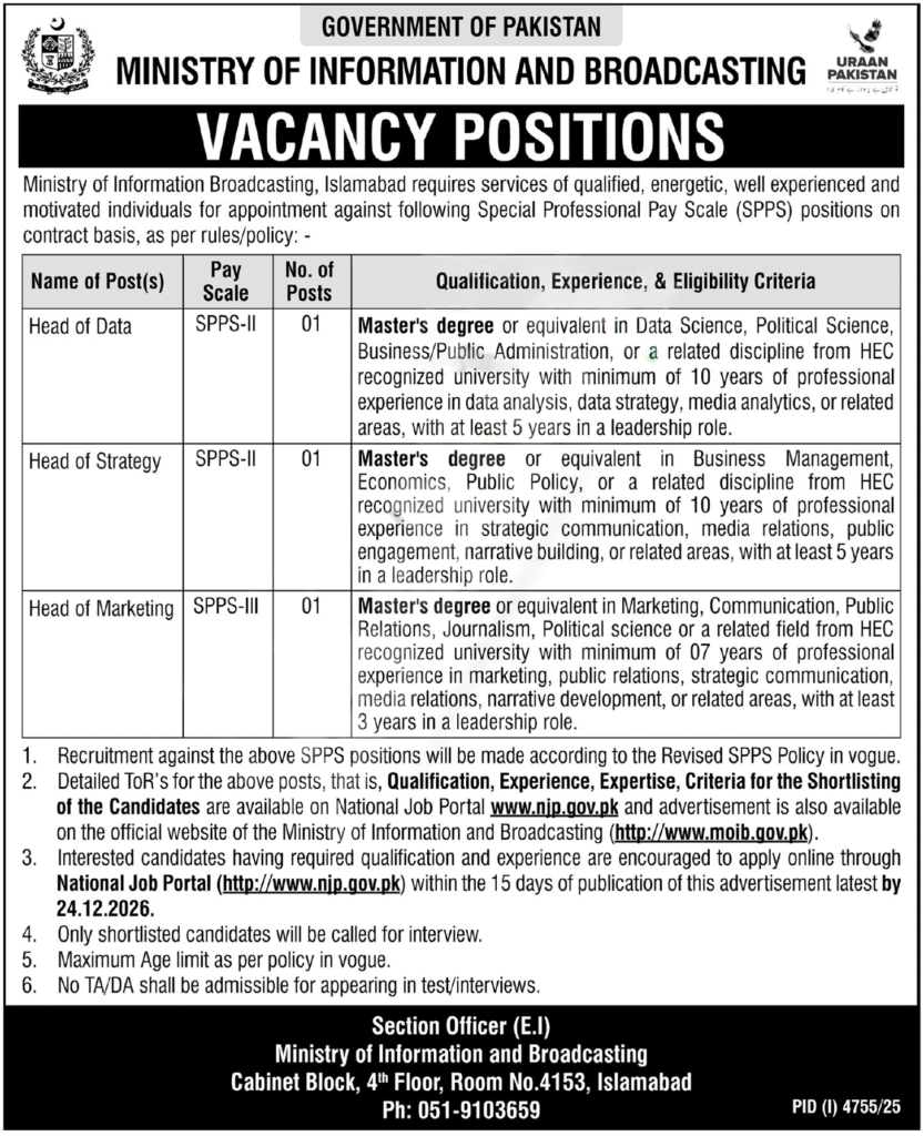 - Type.Ministry of Information and Broadcasting Pakistan New Jobs 2025 – Apply Online