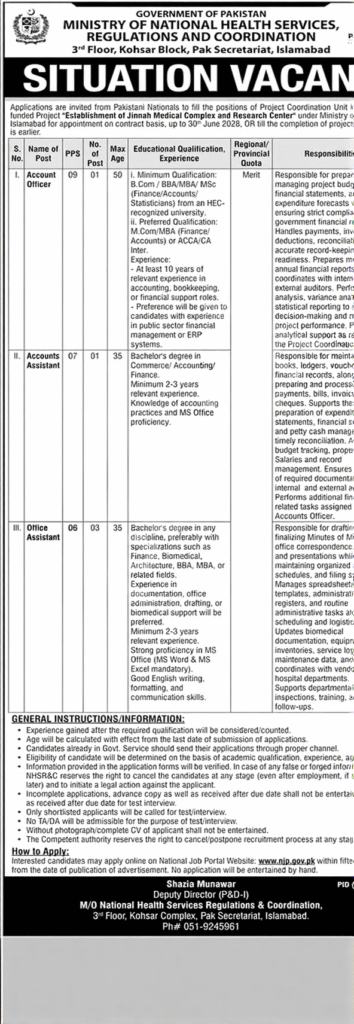 These jobs for candidates will continue on a contract basis until 30th June 2028, from which candidates can get many benefits. Or will they remain until the project is completed. Therefore, candidates should not delay, those who have experience in their field should apply. Candidates who perform their duties well and work in the health sector should be promoted. The Government of Pakistan has released these vacancies for those special people who are well-versed in the fields of finance administration, records management, accounting, and office support. Because even though these jobs are contract-based, the professional environment and performance-based advancement opportunities are great for people. Therefore, candidates with skills and experience will be highly valued.