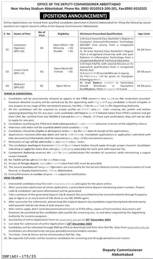 - Type Office of the Deputy Commissioner Abbottabad – 2025 ETEA Recruitment & Application Form