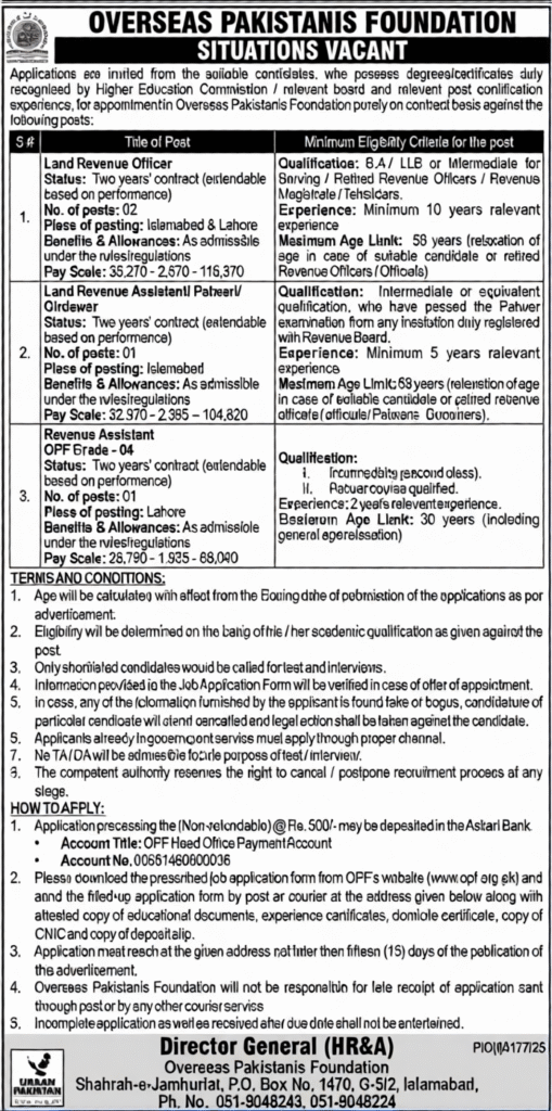 - Candidates who are going to apply for Overseas Pakistanis Foundation jobs should have a Patwari course and also must have LLB/BA/Intermediate or its equivalent degree from a recognized institution.