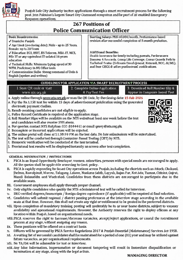 The jobs announced by the Punjab Safe Cities Authority are related to smart city projects. The institution for which candidates are being recruited is the recruitment of Police Communication Officer. These are the vacancies of this institution for which candidates should apply because these vacancies have been allocated for projects established in different districts and tehsils of Punjab. Its main objective is to further improve the security of the public through modern communication systems. This institution has announced more than 200 vacancies. These jobs are a great opportunity for candidates who want to work in the field of information technology and communication and are aspiring for a government institution. The appointments of the candidates to these posts will be made on contract basis but if the performance is good then there is a possibility of extension. In addition, the candidates will be given an attractive salary package as per the policy of Punjab Safe Cities Authority after recruitment. The initial salary is good and can be improved later with experience and performance. Along with this, the candidates will also be provided with a safe and professional environment where employees can hone their skills.‎The procedure for applying online for the posts of this orga.