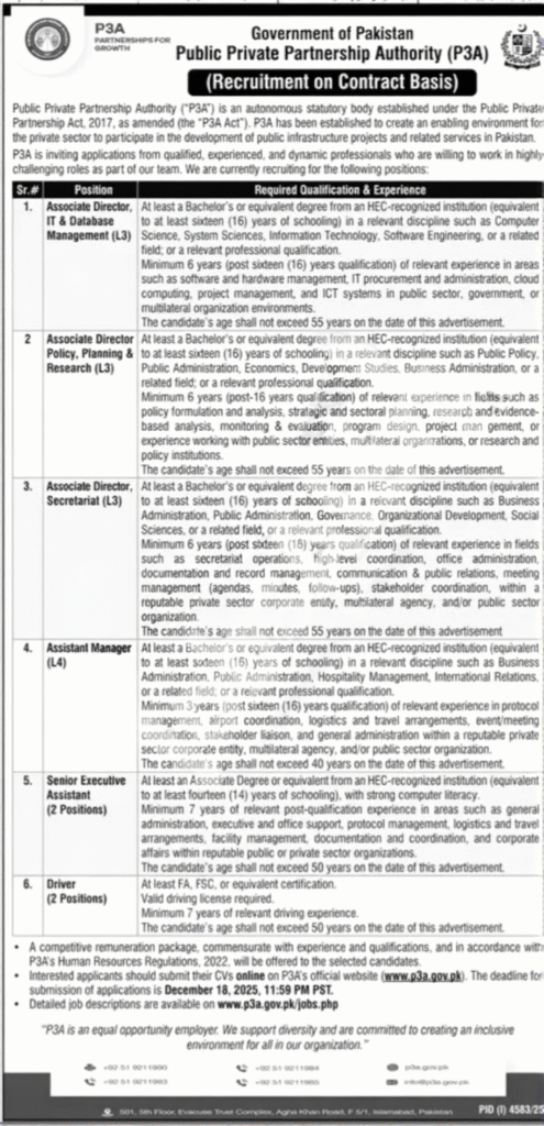 You can see the jobs of Public Private Partnership Authority that have been released.Associate Director, IT and Database Management, Associate Director Policy, Planning and Research, Associate Director Secretariat, Assistant Manager, Senior Executive Assistant, Senior Executive Assistant, Driver.All these vacancies are federal government jobs, and the selected candidates will be provided with a permanent salary, facilities, and dignified work.P3A also provides its employees with professional development opportunities that set this organization apart from other government departments.Eligible candidates should submit their applications within the stipulated date and play their role for the development of the country.We advise all candidates to read it carefully and apply for the job of their choice.